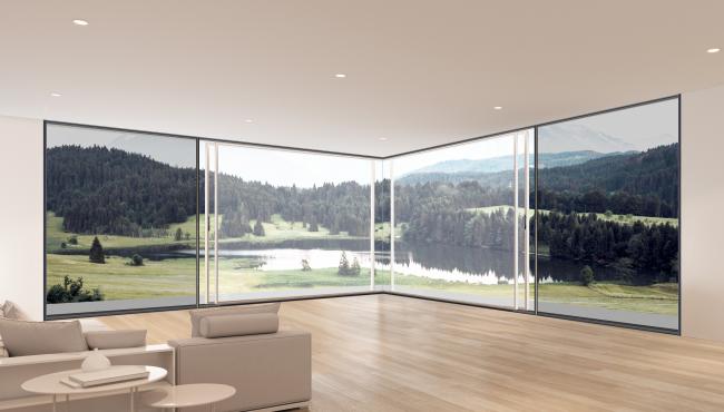 S4 Cornerless complements large post-less sliding and folding doors. Two blinds meet at a 90-degree angle opening.